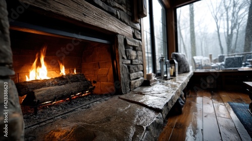 Cozy Interior with Stone Fireplace and Winter View Outside in a Rustic Cabin Living Room