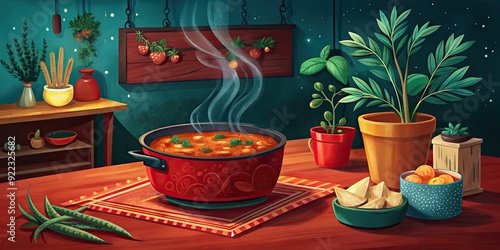 cosy, kitchen, steaming, pot, array, spice, interior, home, cooking, culinary, scene, warmth, atmosphere, light, favor, meal, preparation, domestic, environment, fragrant, aroma, rustic