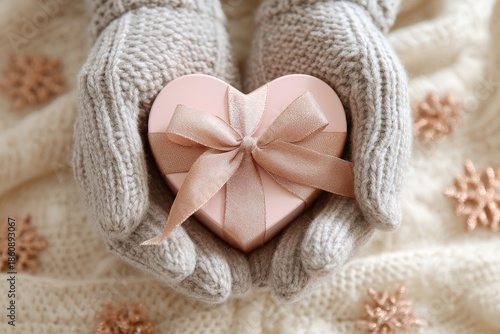 Cozy knitted mittens carefully hold a small, heart-shaped present adorned with a satin bow