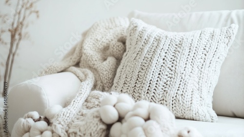 Cozy knitted throw pillows and blanket on sofa soft cream texture home decor