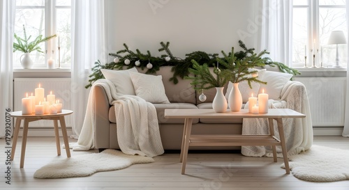 christmas, cosy, living, room, festive, greenery, candlelight, warm, peace, spirit, home, decor, holiday, winter, celebration, comfort, interior, couch, sofa, table, candle, fir, branch, vase, white, soft, light, natural, inviting, seasonal, homelike, tranquil, elegant