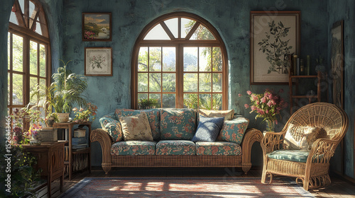 living room, sofa, floral, natural light, plant, decor, cosy, interior design, vintage, sunlight, home, furniture, greenery, comfortable, rustic, inviting, atmosphere, relaxation, style, architecture, window, cushion, bookshelf, flower, art, warm, space, aesthetic