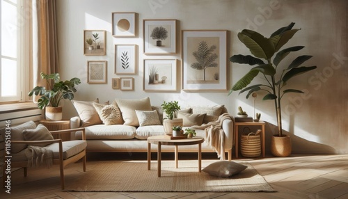 Cozy living room, neutral color palette, beige sofa, wooden coffee table, framed botanical prints, potted plants, natural light, textured throw pillows, woven basket, minimalist decor, earth tones, so