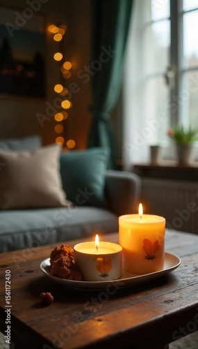 Cozy living room scene with a burning candle on a wooden table, soft light creating a warm and inviting atmosphere Perfect for home decor, relaxation, and hygge themes , relaxation, home decor