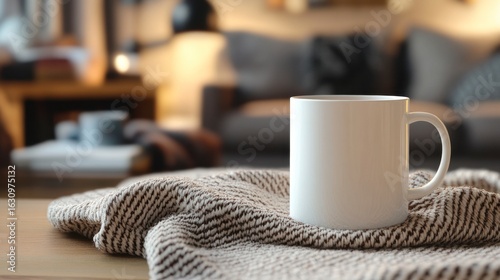 Cozy Living Room Scene with White Mug and Warm Knit Blanket