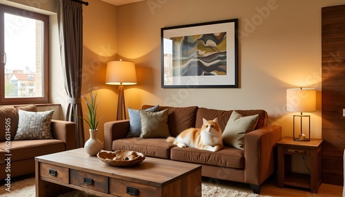 living room, cat, sofa, cosy, furniture, indoor, relaxing, home, comfort, modern, cushion, decor, lighting, pet, charming, artistic, table, hardwood, plant, warm, brown, comfortable, casual attire, atmosphere, lifestyle, contemporary, apartment, soft light, window, wooden, room, relaxation, stylish, home decor, texture, beige, cushion, elegant, interior, calmness, harmony, furnishing, calm, inviting, domestic