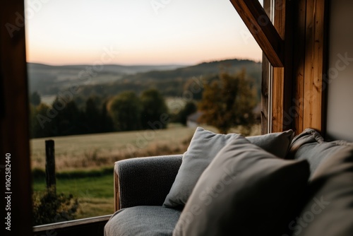 Cozy Living Room with Exposed Timber Frame Window, Minimalist Interior Design, Residential Building Architecture