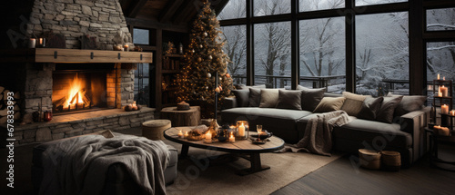 Cozy living room with fireplace and christmas tree, panorama.