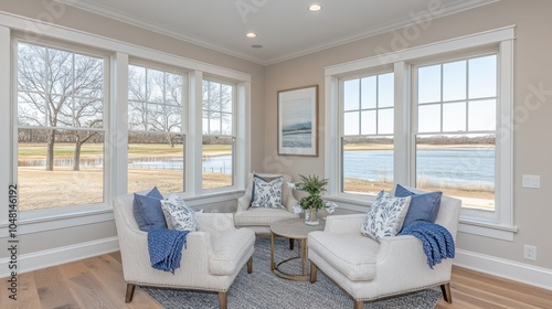 Cozy Living Room with Lake View White Armchairs and Blue Pillows