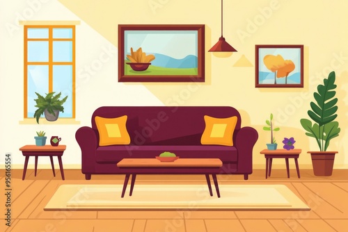 couch, sofa, living, room, interior, design, home, decor, furniture, plant, plant, window, wall, art, artwork, picture, frame, lamp, light, hanging, ceiling, floor, rug, carpet, wood, brown, purple, yellow, green, orange, beige, table, hot drink, end, side, pillow, pillow, cushion, cushion, pot, vase, flower, floral, leaf, sunlight, shade, cosy, comfortable