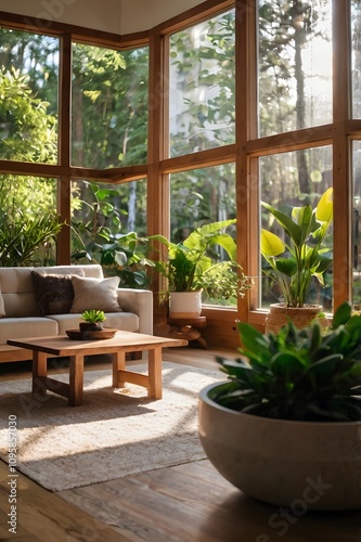 Cozy living space with natural wood accents and warm sunlight