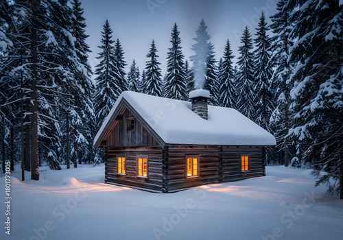 cabin, log cabin, winter, snow, forest, tree, evergreen, pine, snowy, cosy, warm, light, smoke, chimney, rustic, secluded, isolated, peaceful, tranquil, serene, night, evening, dusk, twilight, landscape, nature, wilderness, outdoors, remote, shelter, home, dwelling, architecture, wood, log, winter scene, winter landscape, magical, enchanting, inviting, holiday, christmas, seasonal