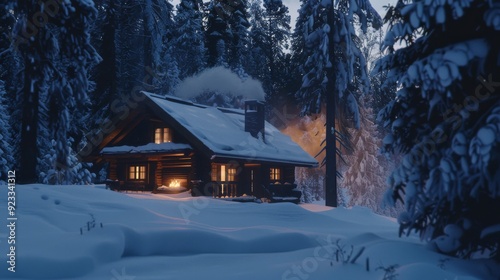 Cozy log cabin warmly lit, nestled in a snowy forest, smoke gently rising from the chimney, evoking a serene winter evening.
