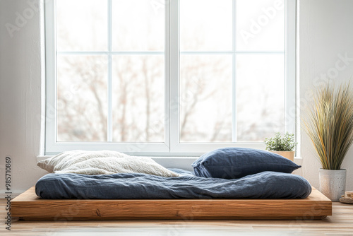 Cozy minimalist bedroom featuring a wooden bed with soft pillows by a large window, bathed in natural light during the day