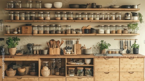 kitchen, interior, storage, jar, herb, utensil, bamboo, organisation, cosy, minimalist, home decor, spice, clean, modern, natural light, counter, kitchen utensile, countertop, cooking, culinary, design, plant, aesthetic, functional, warm, rustic, contemporary, tidy, ingredient, food, preparation, home, workspace, atmosphere, lifestyle