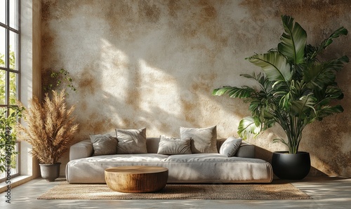 living room, minimalist, sofa, coffee table, green plant, window, sunlight, interior design, modern, texture, serene, inviting, bright, decoration, space, home, furniture, cosy, architecture, design, indoor, floor, pattern, light, style, apartment, house, concrete, parquet, luxury, three-dimensional, empty, brown, decor, atmosphere, ambience, natural light, interior, home decor, greenery, comfort