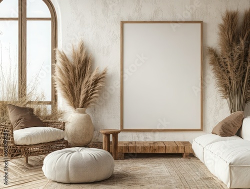 Cozy Minimalist Living Room with Neutral Tones, Natural Elements, and Empty Frame for Artwork Display