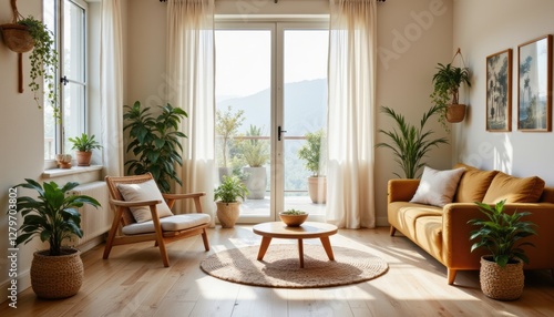 Cozy modern living room with large windows and plants offering a serene atmosphere and natural light