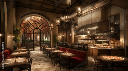 Cozy Modern Restaurant Interior with Warm Ambience and Autumn View