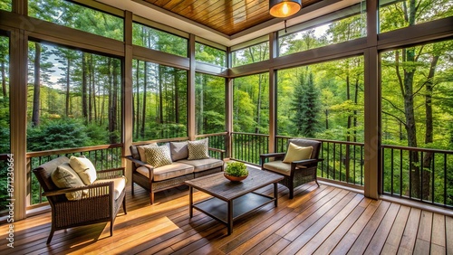 Cozy modern screened porch with transparent plastic windows and durable composite flooring surrounded by lush green summer woods in a serene natural setting.
