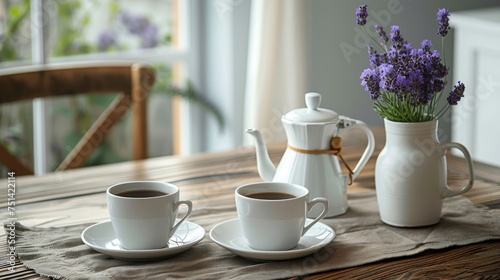 Cozy morning coffee setup with fresh brew in cups and lavender bouquet