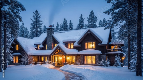 Cozy mountain lodge at night