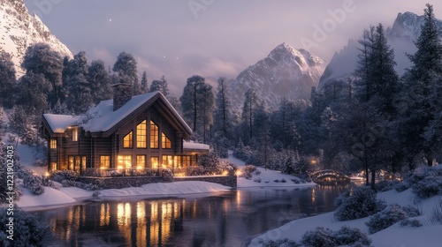 cosy, mountain, retreat, glowing, window, twilight, evergreen, forest, silhouette, majestic, snowy, peak, tranquil, lake, mirror, natural, winter, wonderland, soft, evening, light, rustic, wooden, architecture, untouched, snow, cinematic, landscape, photo