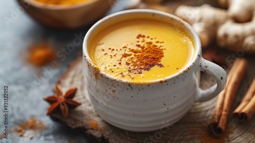 Cozy mug of golden turmeric latte with cinnamon and star anise on rustic wooden board. Winter wellness drink with vibrant and warming flavors.