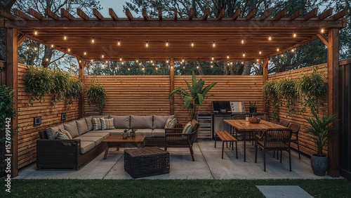 pergola, furniture, lighting, patio, suburban, residence, spot, property, improvement, residential, relaxing, real, living, tranquil, atmosphere, minimalist, shadow, vista, estate, detail, light, contemporary, relaxation, panorama, structure, material, setting, scenery, daytime, location, seating, place, scene, yard, ambience, comfort, plant, rustic, cosy, fixture, rural, backyard, component, deck, home, decking, ground, element