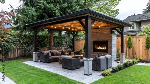 Cozy outdoor seating area with fireplace and soft lighting in residential backyard during early evening