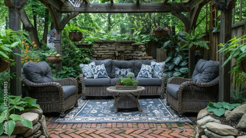 garden, patio, furniture, pergola, seating, sofa, chair, cushion, plant, greenery, landscaping, summer, relaxation, comfort, home, design, decor, style, serene, tranquil, peaceful, nature, rustic, wicker, wood, stone, brick, flower, leaf, tree, cosy, relaxing, escape, retreat, environment, landscape, view, area, space, setting, scene
