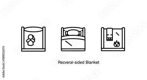 Cozy Person with Blanket, Warm Bed, and Fireplace Scene Outline Icons Set for Home Comfort