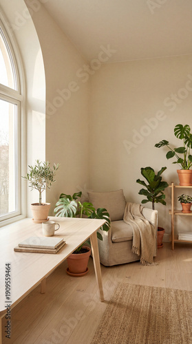 reading, nook, sofa, blanket, plant, table, mug, neutral, minimal, calm, armchair, potted, indoor, natural, light, window, arch, wooden, floor, rug, cosy, serene, lifestyle, relaxation, home, interior, living, room, scandinavian, beige, terracotta, shelf, decor, sustainable, botanical