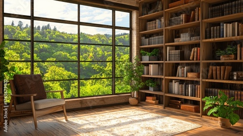 Cozy Reading Nook with Large Window and Bookshelf in Bright Room