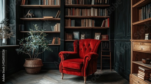 Cozy Reading Nook with Vintage Red Armchair and Bookshelves in a Dimly Lit Room Surrounded by Elegant Decor and Potted Plant for a Warm Ambiance