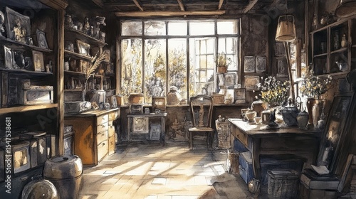 room, interior, shelf, object, window, sunlight, rustic, cosy, vintage, antique, cluttered, book, artwork, decoration, furniture, chair, table, light, shadow, wood, warm, home, decor, artistic, painting, illustration, watercolor, style, design, indoor, storage, collection, display, arrangement, still life, atmosphere, peaceful, quiet, inviting, comfortable, organised, detailed, realistic, traditional, old, aged, nostalgic