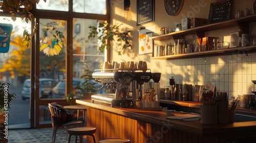 Cozy Scandinavian cafe with warm lighting and a freshly brewed cappuccino.