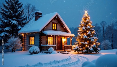 Cozy snow-covered cottage with Christmas tree and twinkling lights , tree, cottage, lights