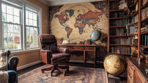 cosy, study, vintage, earth, map, wallpainting, leather, chair, globe, reading, warm, ambience, relaxation, bookshelf, desk, interior, decor, roomy, natural, light, home, office, inviting, tranquil, design, atmosphere, literature, scholarly, comfortable, heritage, art, cognition, travel, exploration, rustic, aesthetic, personality, history, classic, stylish, elegance, warmth, furniture, landscape, wall