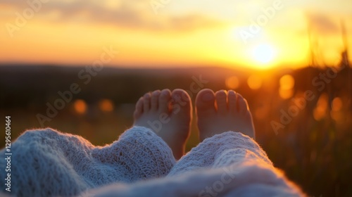 sunset, foot, blanket, grass, nature, cosy, relaxing, peaceful, evening, serene, summer, outdoors, closeup, landscape, candid, tranquil, home, comfort, soft, calm, sunny, seasonal, horizon, light, colours, daylight, earth, family, holiday, mood, happy, memory, explore, touch, break, scenic, freedom, carefree, sunshine, beautiful day, joyful, relaxation