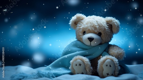 Cozy teddy bear snuggled in bed with starry bedding in a charming child s bedroom decor