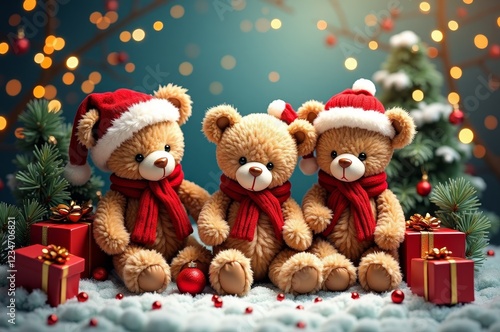 Cozy trio in festive red and white, surrounded by Christmas magic