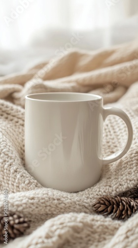 Cozy White Mug on Knitted Blanket with Pine Cones in Soft Lighting