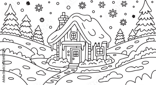 Cozy winter cabin in snowy landscape with pine trees and snowflakes, hand-drawn Christmas scene in black and white for coloring