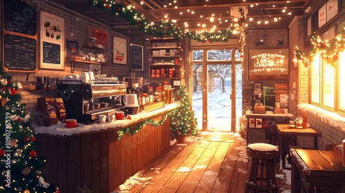 Cozy winter caf�� decorated for Christmas with warm lights and festive decor.