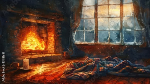 Cozy winter evening, fireplace crackling, soft light illuminating a room with blankets and tea