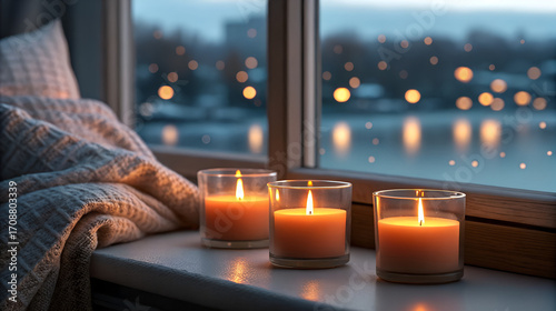 winter, cosy, candle, window, evening, warmth, comfort, snow, night, indoor, home, relaxation, peaceful, serene, atmosphere, lighting, flames, glow, soft, ambient, decoration, interior, seasonal, holiday, christmas, festive, wintery, cold, outside, landscape, light, bokeh, blurry, outdoors, nature, water, blanket, textile, texture, still life, mood, tranquil