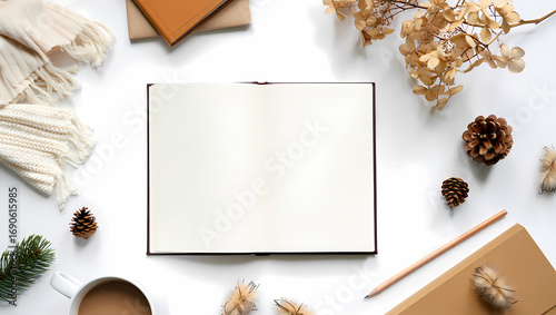 Cozy winter flat lay with open notebook isolated on white background, surrounded by warm scarf, pine cones, and coffee cup