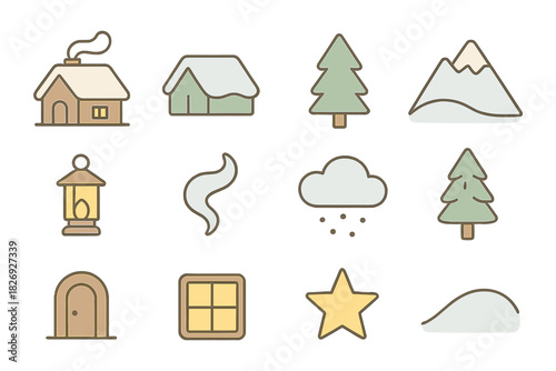 Cozy winter icons collection: rustic cabins, snowy trees, and festive symbols