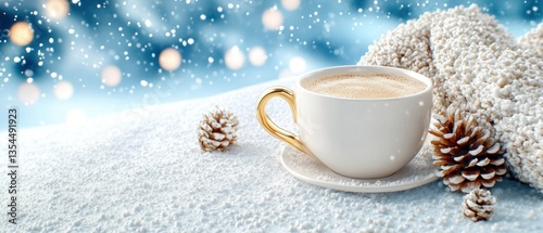 winter, snow, hot drink, cup, mug, hot, drink, cosy, warm, christmas, holiday, festive, wintery, snowflake, snowy, cold, season, frost, chill, pine cone, cone, sweater, blanket, comfort, relaxation, peace, serenity, calm, quiet, tranquil, stillness, white, gold, creamy, delicious, beverage, photo, still life, image